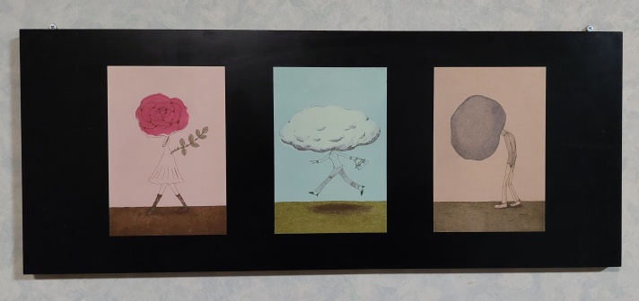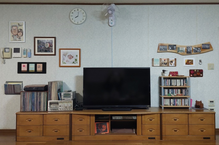 宇賀渓キャンプ場の「ギャラリー&カフェ コナラ」で買ったポストカードや小物をリビングに飾っています。