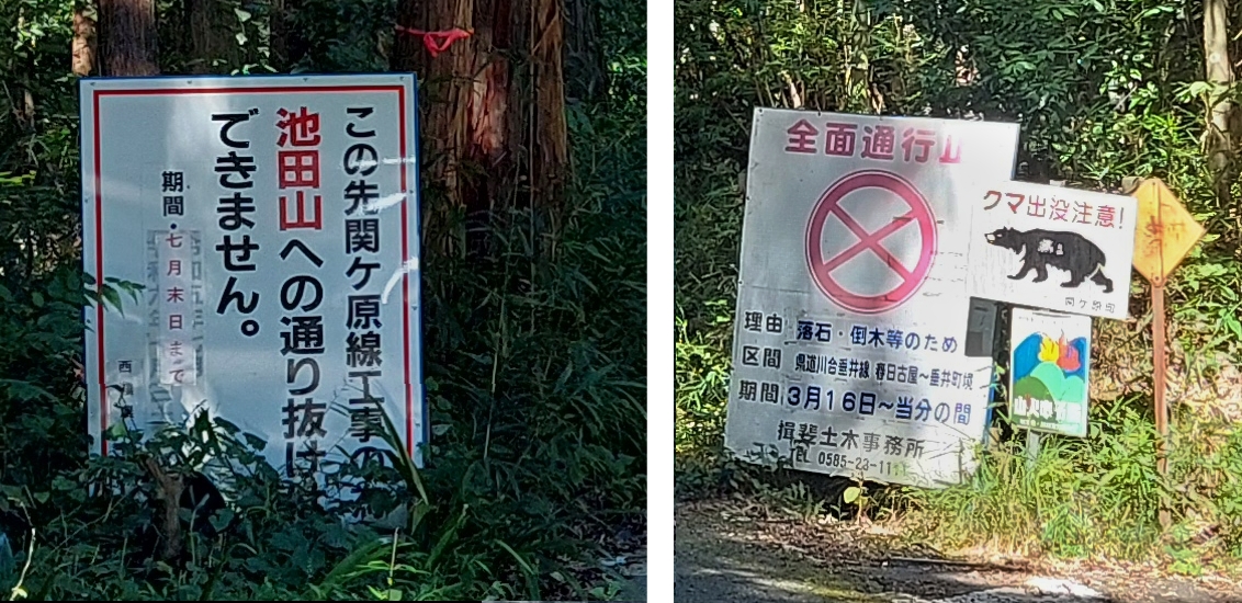 13:45 岩谷峠 (魚見峠)に向かう池田南条線に通行止め看板 (´ヘ`;)