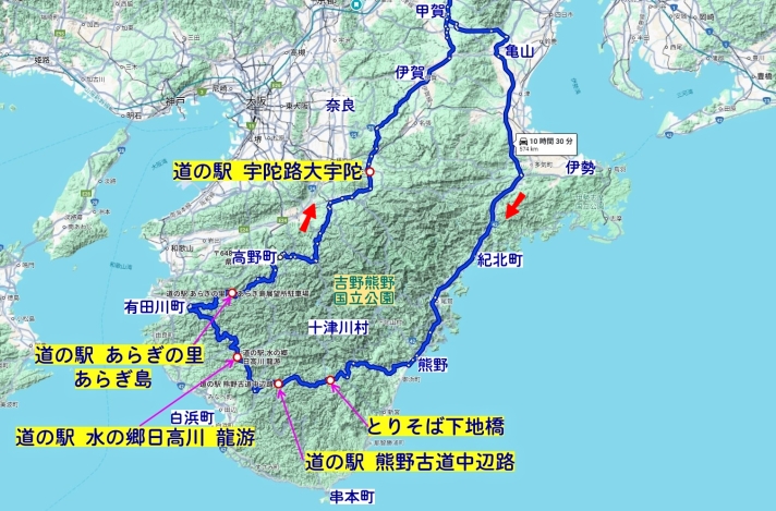 大型バイクは、タイヤ交換待ち状態で乗れないので、250ccのオフロードバイクで、500km&10時間以上の以下のルートに強引に出発しました。