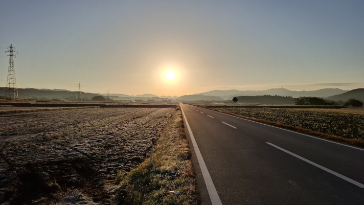 畑には霜が降りており、道路沿いの気温計は、3℃を表示しており、寒いはず (´ヘ`ι)ゞ