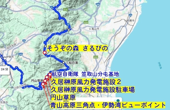 鈴鹿山脈沿いを南下、国道1号線 鈴鹿峠を越え、関宿手前を右折、大和街道(旧道の国道25号線)を進み、三重県 県道512号線 青山高原公園線へ