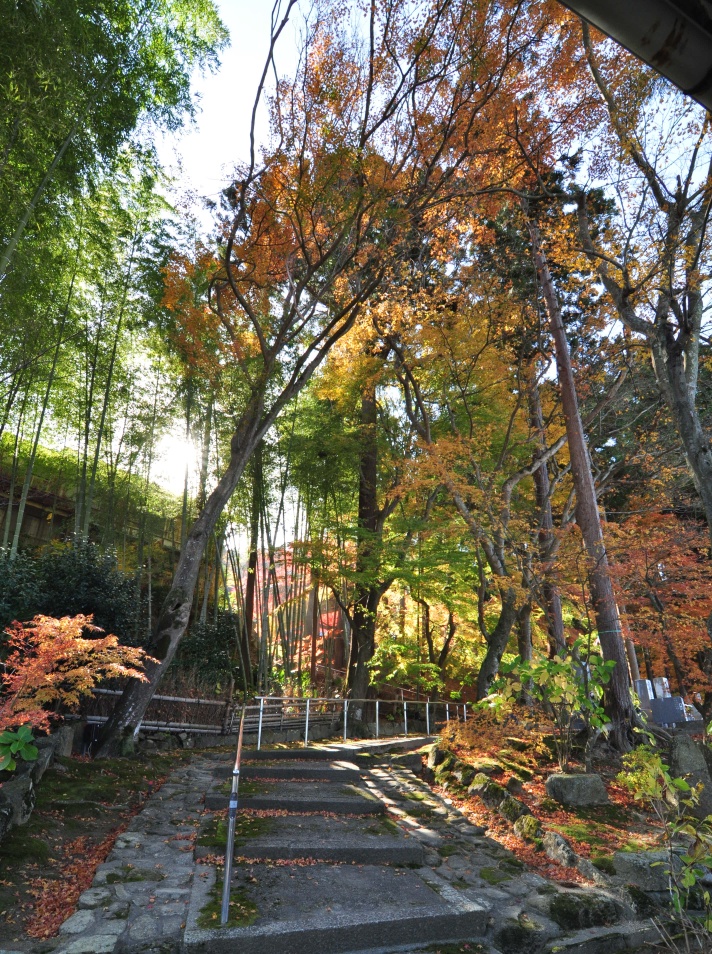 山門をくぐると、午前の日差しが最後の紅葉を輝かせていました。