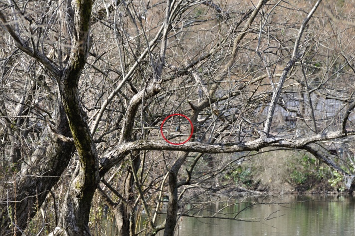 突然、玉虫色の小さな鳥が横切って、池の雑木に止まりました。