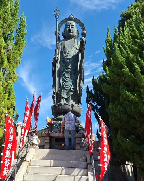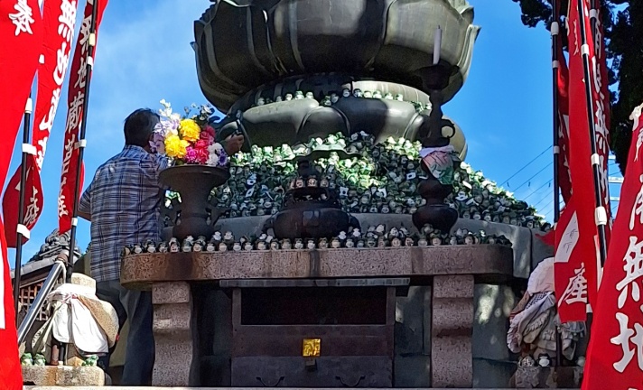 陶器の身代わりカエル(¥1,000)に、名前と年齢を書入れて、仏様の足元に供える私