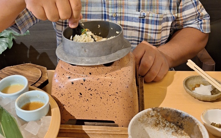 私は、鯛ときのこの釜めし & 鱧の湯引き & たこの唐揚げ
