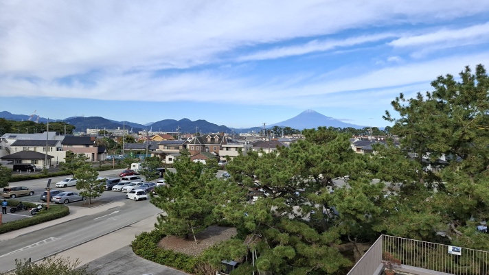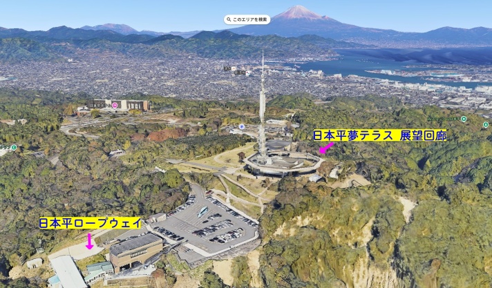 「みほしるべ」の屋上から、三保の半島(街並み)と富士山を望んでいます