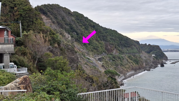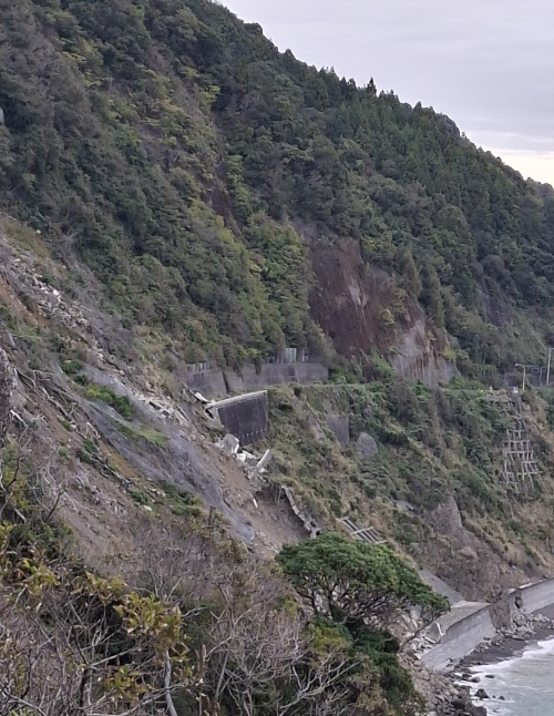 ホテルすぐ隣の半島斜面が大規模に崩れていました