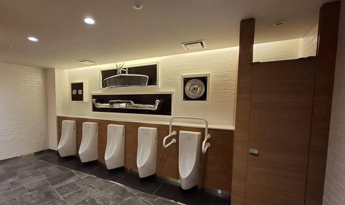 小便器の壁には、バンパーやグリルやホイールキャップが