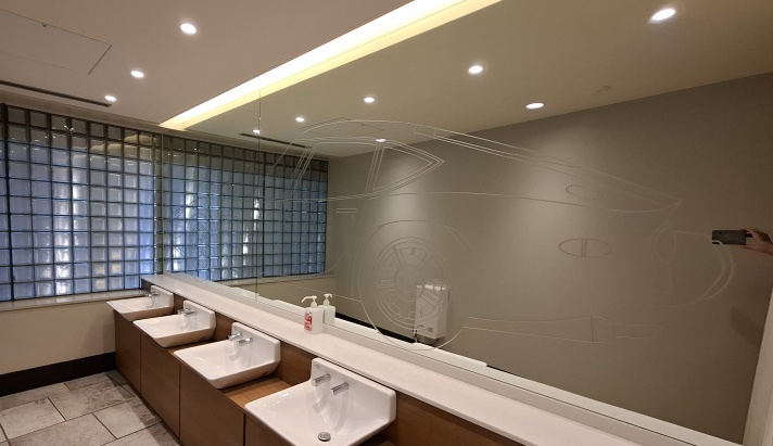 洗面台鏡にも、トヨタ2000GTのシルエットが刻み込まれていました